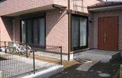 門扉の製品を建物の雰囲気に合わせ、「茶」の入ったデザインの物にし、それに合わせてFIXフェンスや跳ね上げ式ゲートもコーディネートしたのですが、1つ悔やまれるのが、この時期に門扉と同じデザインのフェンスやゲートが無かった事ですね。